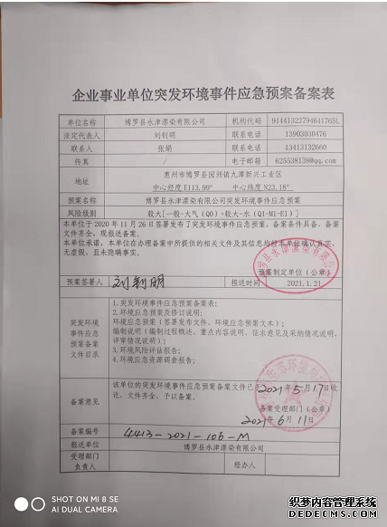 | 應(yīng)急預(yù)案備案函 | 突發(fā)環(huán)境應(yīng)急預(yù)案備案登記表 | 博羅縣環(huán)境保護(hù)局 | 2021-6-11 | |